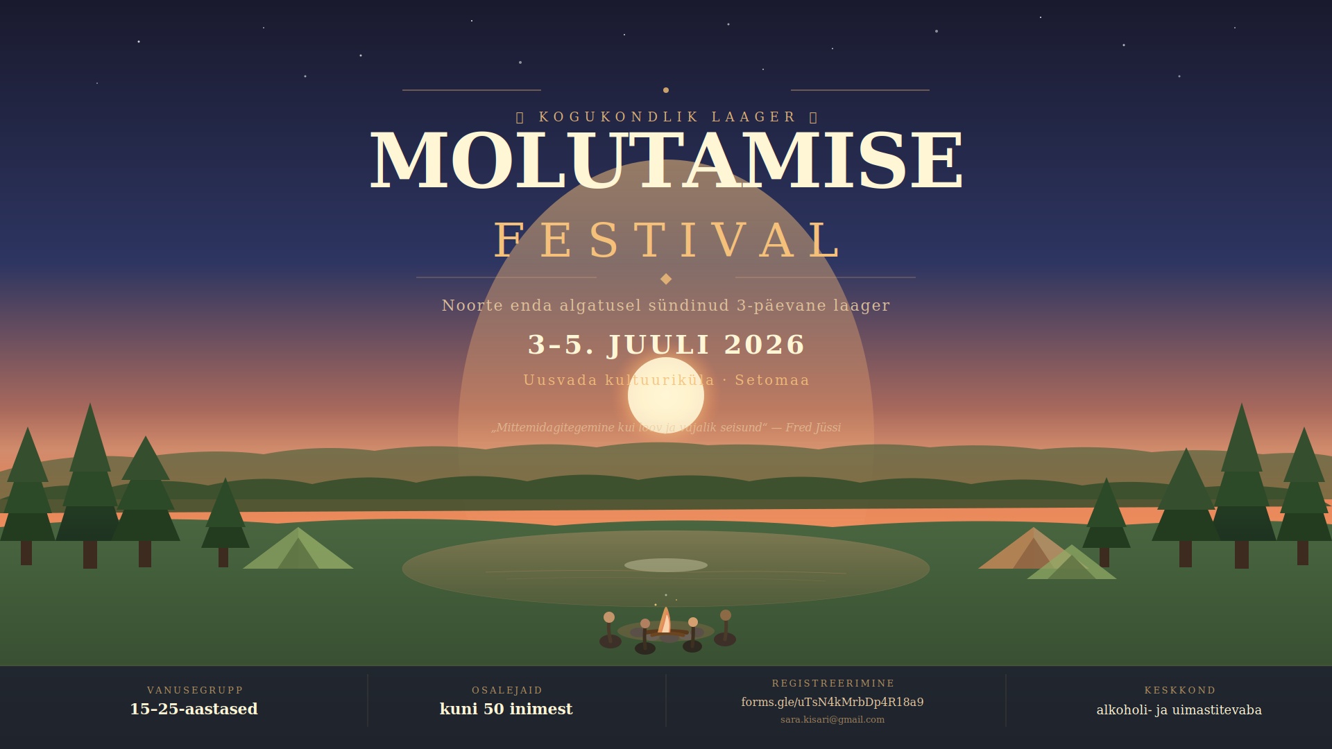 Noorte Molutamise Festival on noorte enda algatusel sündinud 3-päevane kogukondlik laager, mis toimub 3.–5. juulil 2026 Uusvada kultuurikülas Setomaal. Projekti idee kasvas välja noorte kogemusest – pidev kiirus, surve ja ootused koolis ning igapäevaelus on loonud vajaduse ruumi järele, kus saab lihtsalt olla, ilma kohustuseta olla pidevalt produktiivne või edukas . Festival ei ole klassikaline …
